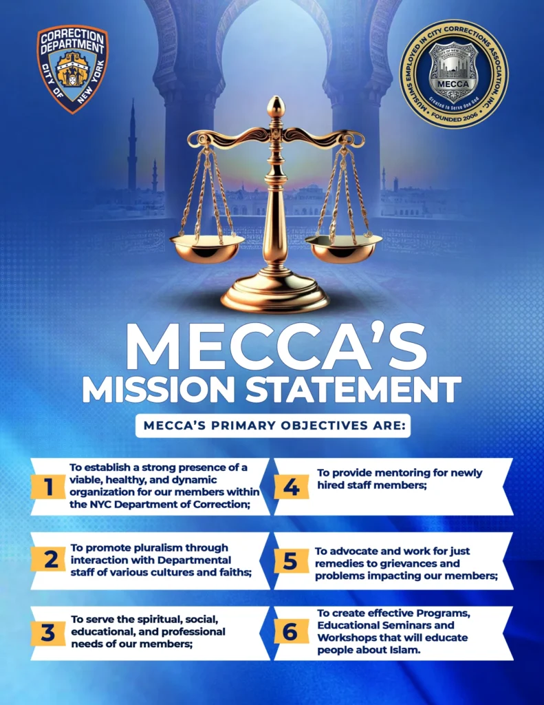 Muslims Employed in City Corrections Association, Inc. (MECCA) is a non-profit fraternal organization established in 2006 to support Muslim uniformed and non-uniformed employees of the New York City Department of Correction.