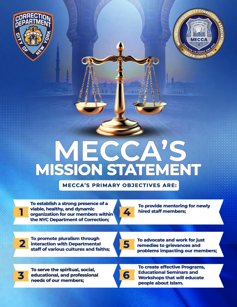 Muslims Employed in City Corrections Association, Inc. (MECCA) is a non-profit fraternal organization established to support Muslim uniformed and non-uniformed employees of the New York City Department of Correction.